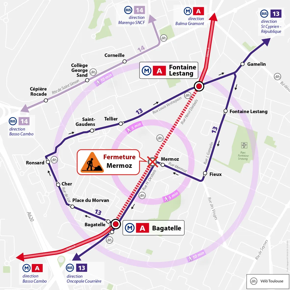 Afin de limiter les désagréments, Tisséo invite ses usagers à rejoindre les stations les plus proches. Celles de Bagatelle et Fontaine Lestang sont situées à moins de 10 minutes à pied.