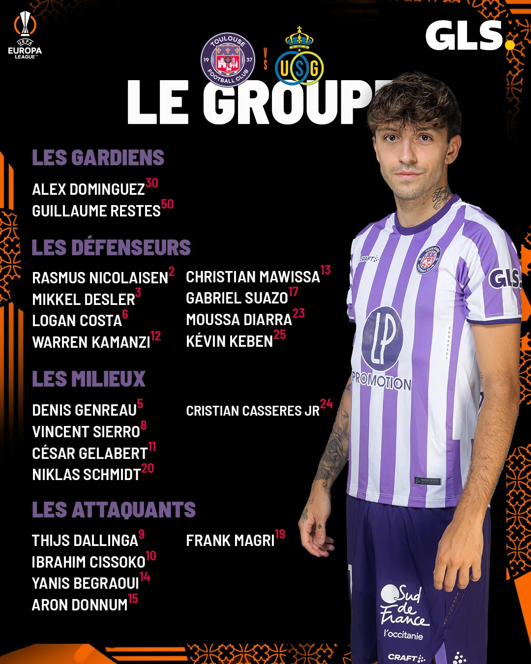 Le Toulouse FC peut s'appuyer sur un groupe quasi-complet pour affronter l'USG, à l'exception de Naatan Skyttä (reprise), Mamady Bangré (dos), Stijn Spierings (non-qualifié) et Zakaria Aboukhlal (genou), mais avec les retours de Niklas Schmidt et Thijs Dallinga, suspendus le week-end dernier à Nice.
