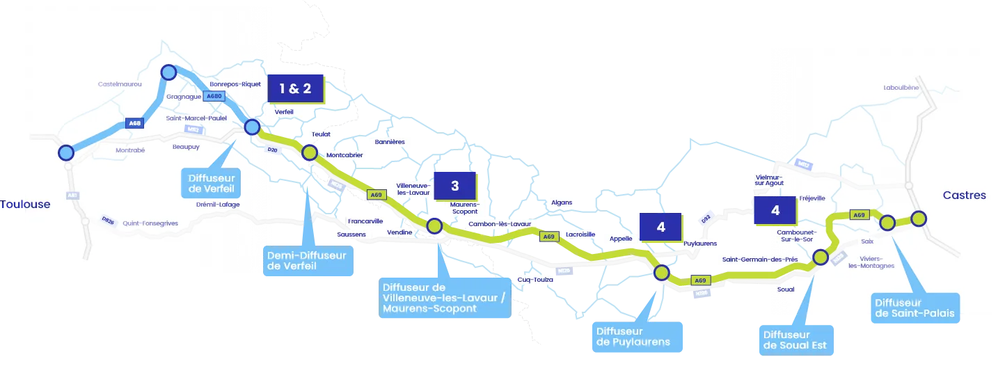 Malgré les vives oppositions, les travaux sont maintenus par son gestionnaire Atosca. L'autoroute A69 va relier les communes de Verfeil (Haute-Garonne) à Castres (Tarn) sur 54 kilomètres, pour un gain de temps de 25 minutes en voiture. Le montant de l'A69 s'élève à 450 millions d'euros.